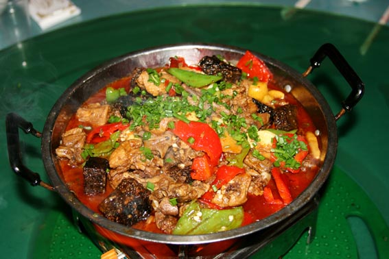 【 農(nóng)家菜豆腐 】 菜豆腐是鳳凰縣苗族和土家族常用的家菜和土菜。打豆腐之后,將剩下的較粗的豆汁留下,炒吃時(shí)一般拌白菜煮烹。菜豆腐煮好后,再在其上面放一上些火燒擂辣椒汁。吃時(shí)鮮嫩可口,對健身健胃,促進(jìn)血液循環(huán)和加速消化極有好處。菜豆腐是苗家、土家常食用的一種名菜,也可算為美味佳肴。