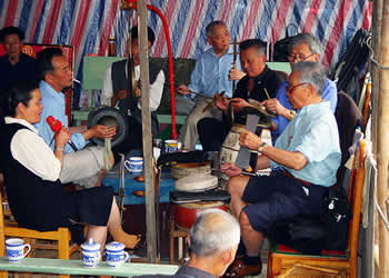 圍鼓(含嗩吶)。又稱打鎦子、打排鼓,是民間紅白會中不可缺少的樂器。一般7人演奏,樂器有一鼓、一大鑼、一公鑼、兩副鈸、兩嗩吶。其詞曲紅白會通用,以鼓和嗩吶上系紅、白布為分別標記(結(jié)婚不打“四字鈸”曲)。史傳的圍鼓詞有《撩子》、《火鋪》等,《撩子》分《一二三》、《閃翅》、《堆羅漢》、《反落花》等十章,《火鋪》也分《三槍》、《四進門》、《八哥洗澡》、《蓮魚吐絲》等十章,嗩吶詞有《八十正宮》調(diào)等。在農(nóng)村,圍鼓是最普及的樂器,每逢紅白喜事都有圍鼓和嗩吶表演。
