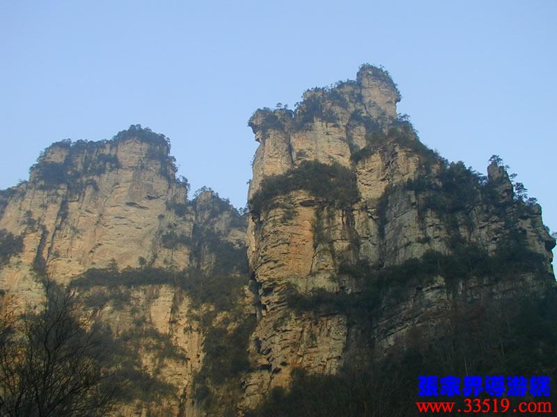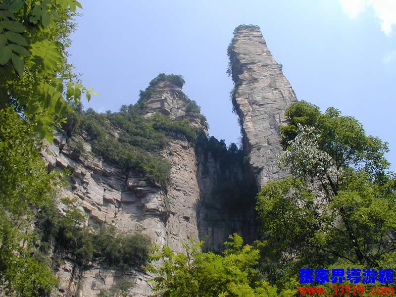(金鞭巖、神鷹護(hù)鞭)如果要問(wèn)張家界國(guó)家森林公園的標(biāo)志景點(diǎn),答案是現(xiàn)成的:金鞭巖。早在清代中期,一些文人就把張家界的峰林及百丈峽列入“永定八景”。其一叫“危峽啼猿”;其二叫“層巖涌塔”:“縣西二十里青崖山,其前五山并立,層峙如浮圖。中一峰更峻拔,上插宵漢,晴輝雪積,最擅奇觀。”這里說(shuō)的“其中一峰”,指的金鞭巖。八大景點(diǎn)張家界占其二,可見(jiàn)先人是有眼力的。金鞭巖相對(duì)高度380多米,拔地而起,直插云霄,無(wú)論你遠(yuǎn)看近看,正看側(cè)看,都是一根刺破青天的長(zhǎng)鞭!在金鞭巖左側(cè)的那座巖峰,大家看多像一只兇猛的老鷹,勾嘴瞪眼,雙翅略展,時(shí)刻警覺(jué)地守護(hù)著金鞭,人稱(chēng)“神鷹護(hù)鞭”。