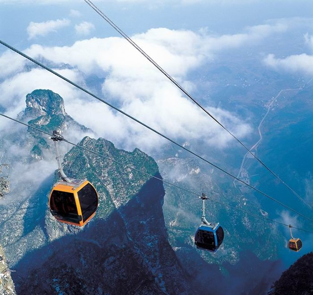 ②、張家界天門山索道為全世界最長的觀光客運(yùn)索道,索道線路斜長7455 米,索道運(yùn)行速度為每秒 6 米,單程運(yùn)行時(shí)間約28分鐘。上、下站水平高差1279米主要設(shè)備均由法國POMA公司原裝進(jìn)口,索道鋼繩來自于法國, 98 個(gè)吊廂來自瑞士 CWA 公司,單個(gè)造價(jià)高達(dá) 20 萬元人民幣。有嚴(yán)重心臟病或恐高癥等患者不建議乘坐;