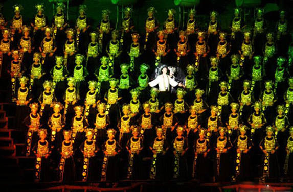 以此基礎(chǔ)進(jìn)行了藝術(shù)再創(chuàng)造,悲傷、歡樂、笑容、淚水交合成一個(gè)曲折動(dòng)人的故事。整場(chǎng)演出體現(xiàn)人物細(xì)節(jié),以個(gè)性化的敘事結(jié)構(gòu)給人以親近感和頭尾呼應(yīng)的完整感。汲取世界豐富的音樂文化元素和表現(xiàn)形式,輔之以現(xiàn)代高科技的舞臺(tái)特效技術(shù),對(duì)世界音樂歌舞劇的一次成功的創(chuàng)新,成為中國山水實(shí)景演出的劃時(shí)代巨獻(xiàn)。