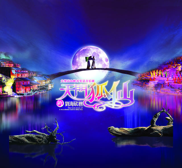 《天門狐仙——新劉??抽浴纺壳笆鞘澜绲谝慌_(tái)有完整故事情節(jié)的山水實(shí)景音樂歌舞劇。舞臺(tái)選址在天門山風(fēng)景區(qū)山門口內(nèi)至天門山頂?shù)恼麠l峽谷,總投資達(dá)到1.2億元,演員隊(duì)伍達(dá)530多人。主舞臺(tái)以10000平米的玻璃鋼打造,是目前世界最大的全景玻璃鋼舞臺(tái)。音樂主創(chuàng):譚盾。