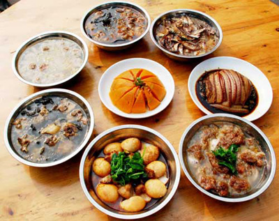 如果說靖港的吃名聞遐邇,有口皆碑,那么,八大碗則是靖港吃之翹楚,也是古鎮(zhèn)人引以為榮的傳統(tǒng)名牌。從前靖港街上數十家有名餐館,都把八大碗當作各自的招牌菜,各餐館的廚師也都是潛心研習,精益求精,把烹制出高水平的八大碗當作看家本領。曾經繁榮昌盛的“小漢口”靖港,那些停船上岸的船夫,載貨而來的生意人以及慕名而來的浪人,首先就得進餐館吃八大碗,飽其饞吻,享其口福,乃至為了貪吃八大碗而“船到靖港口,順風也不走。”而靖港街上的紅白喜事,也是非八大碗不成宴席。