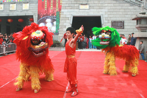 有布獅和毛獅兩種,舞時又分文獅和武獅。文獅刻畫獅子溫馴神態(tài),動作詼諧細膩;武獅顯獅子勇猛,動作幅度強。舞獅的套子有“藤纏樹”、“烏云蓋雪”、“牛戀凼”、“泥鰍彈鍋”、“麒麟送子”等。用打擊樂和吹奏樂伴奏、氣氛熱烈莊重。舞獅時還有贊獅者伴唱,唱詞內容有反映勞動生活、祝賀吉祥、介紹傳說故事等,舞獅者隨唱詞內容和節(jié)奏進行表演。