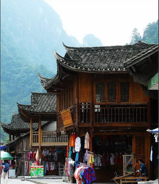 村寨四周山勢(shì)雄奇,絕壁夾天;“夯峽”、“九龍”、“玉泉”三溪在這里相會(huì),如同三根彩帶在這里相交結(jié)。這里是風(fēng)景區(qū)的中心,一萬(wàn)五千多米長(zhǎng)的青石板路從這里一直通向各個(gè)景點(diǎn)這里還是一個(gè)角度十分好的觀景臺(tái),人立于此,只要原地轉(zhuǎn)動(dòng)身子,就可觀賞到東西南北全方位的各個(gè)景點(diǎn),那含情脈脈的“相依巖”、昂首奮蹄的“駟馬峰”、惟妙惟肖的“孔雀開屏”五彩繽紛的“彩云壁”和“畫屏峰”……盡在眼中無(wú)不景象萬(wàn)千,令人目不瑕接。詩(shī)人石元機(jī)贊曰: