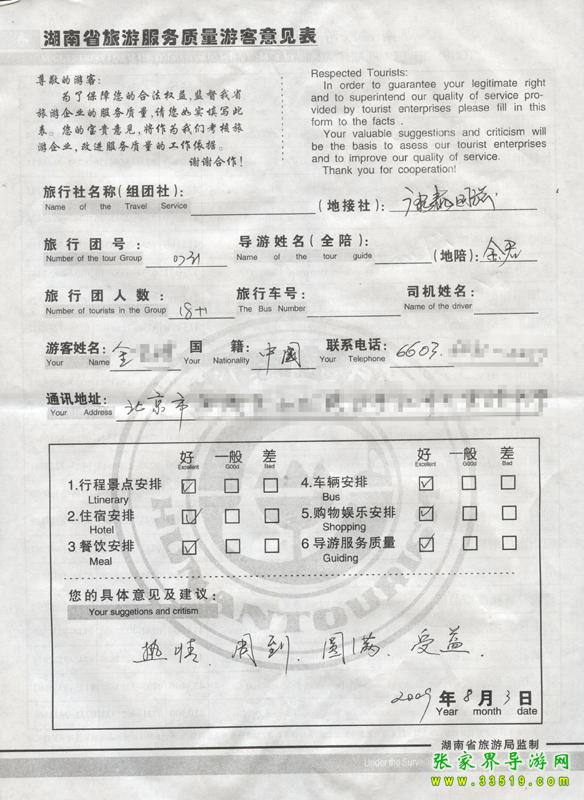 2009年7月31日北京金先生一行19人接待質(zhì)量反饋單: