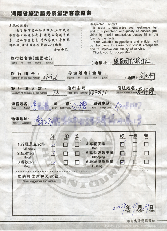 9月26日臺灣李先生一行7人接待質(zhì)量反饋單: