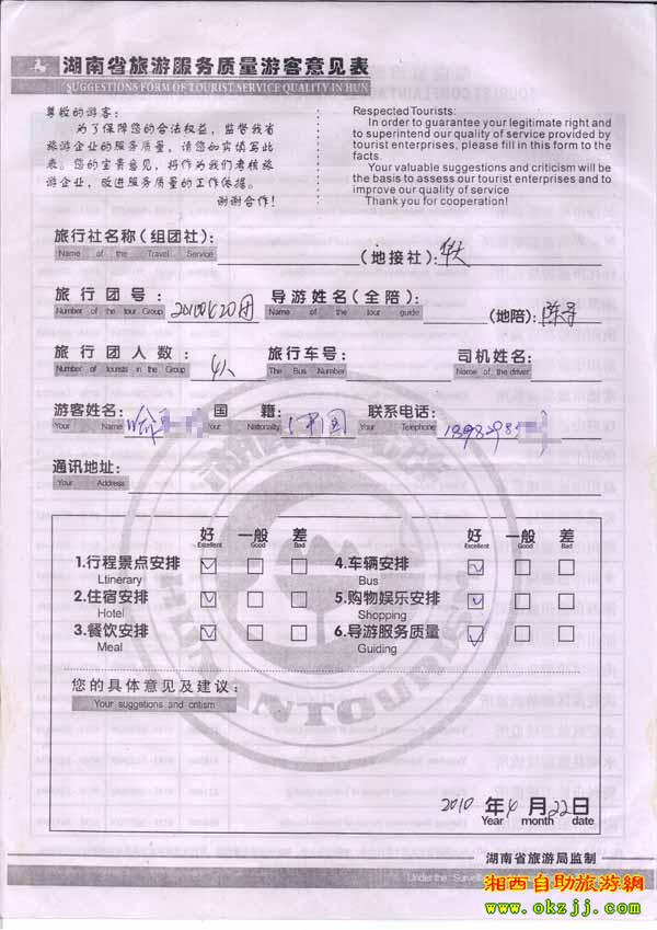 2010年4月22日喻先生一行4位旅游質(zhì)量反饋