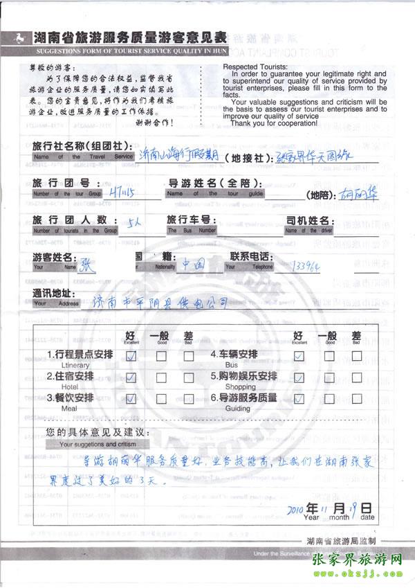 2010年11月15日張小姐一行5人評價導(dǎo)游優(yōu)