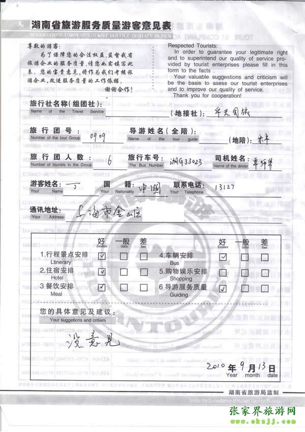 2010年9月9日上海丁先生/女士 給米豐導游好評