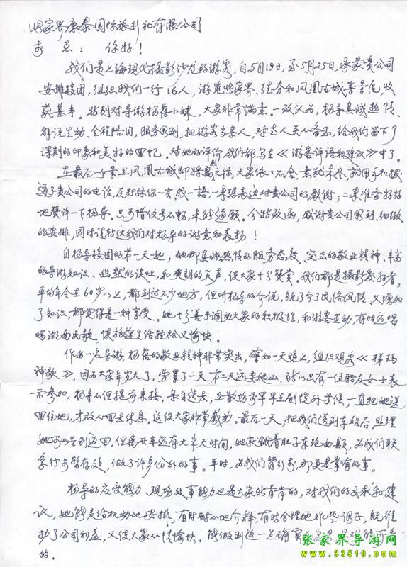 2009年5月19日“上?,F(xiàn)代攝影沙龍”一行16人,參加張家界旅游導(dǎo)游網(wǎng)組織的張家界旅游跟團(tuán),于2009年5月25日結(jié)束行程。游玩期間,由于導(dǎo)游楊蓓的出色講解和周到的服務(wù),得到客人的一致好評??腿颂丶谋頁P(yáng)信一封,如下: