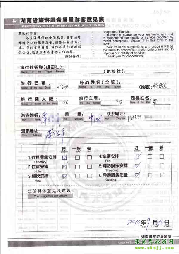 2010年9月22日譚先生旅游質(zhì)量反饋