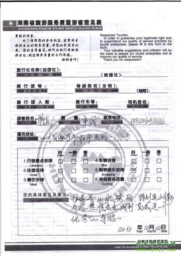 2010年10月2日蔣先生旅游質量反饋:導游服務很好