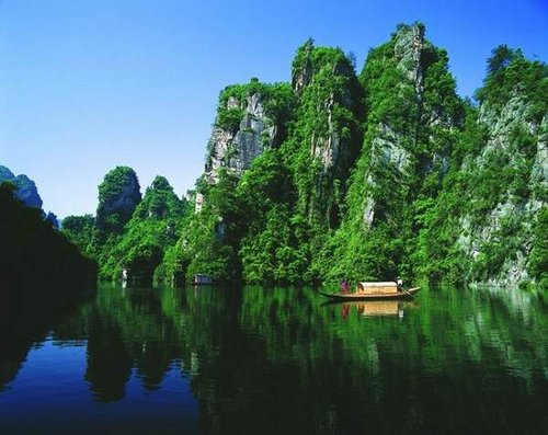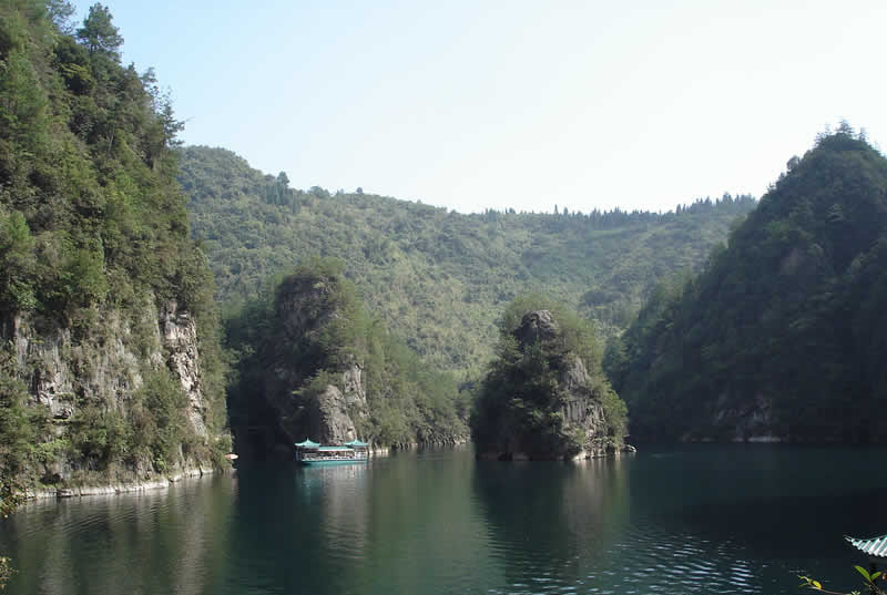 其位于武陵源區(qū)城南1.5公里處,是武陵源風(fēng)景名勝中的精品景點。它是一座罕見的高峽平湖,四面青山,一泓碧水,風(fēng)光旖旎,是山水風(fēng)景杰作。在此蕩舟,還可見到湖心島上“玉瓶開花”、“十女梳妝”、“金龜戲水”、“青蛙鬧春”等佳景。 寶峰湖是一個截流筑壩而成 的人工湖,深72米,長2.5米公里, 以其秀麗的湖光 水色與幽野的洞天情趣成為武陵源水景風(fēng)光的代表之 作。湖中有兩座疊翠小島,近岸奇峰屹立,峰回水轉(zhuǎn)。