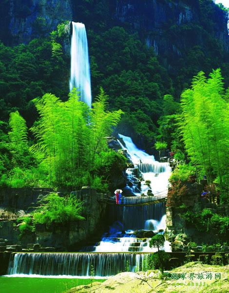 寶峰飛瀑 寶峰橋左前方山腰4O余米處,一水飛流而下。先直瀉,后順坡漫灑于鐵索橋處池中。兩水池相疊,波光盈盈,翠竹、紅樹、人影盡映其中,宛若畫盤。書法家沈鵬游覽寶峰湖后題—飛流界峰”四字,鐫刻于飛瀑石上方峭壁。
